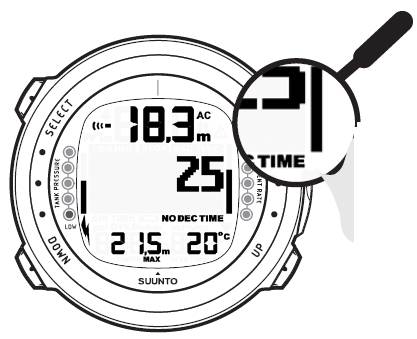 某些时候,不显示数字,而显示一个小横杠加下面是”NO DECTIME“,这表示在这个深度,你可以一直呆到没有气,都不需要减压。