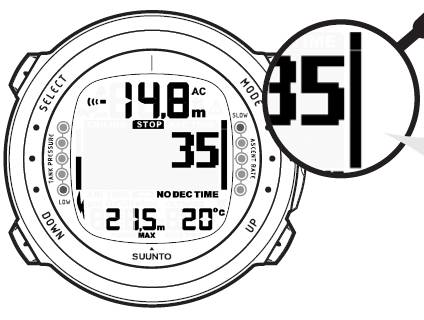 注意:一旦在大于六米的地方,显示“STOP”即表示你违反了上升速度,本次潜水必须执行强制安全停留方可升水。
