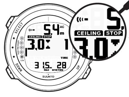 技术要求:当我们在上升速度控制内,上升到六米之上三米之下时,就进入强制安全停留阶段。这时表面显示如图五.3。“CEILING”和下面的3.0表示:最高深度不得高于3.0米。上下相对的二个箭头表示在现在这个深度停止不动。右边的“1”和下面的“TIME”表示在这里停留至少一分钟。只有当强制安全停留完成,“STOP”和“CEILING”显示消失,方可升水。