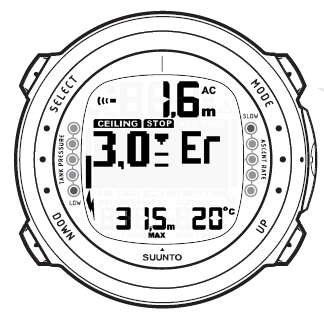 如果此时继续上升,而不在规定的位置停留足够的时间,则表面显示图六.4。向下的箭头表示你必须马上下潜到三米以下。右边的“ER”表示你正在犯严重错误!并有电脑声音报警。如果潜水员在三分钟内,不能回到三米以下,则电脑表进入锁表阶段。意思是本潜水员患减压病风险巨大,在二十四小时内,不得潜水!