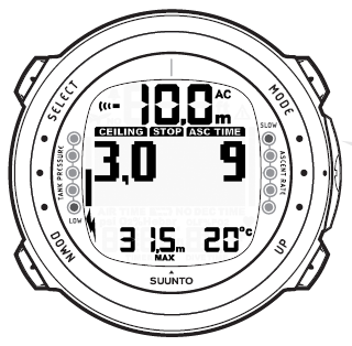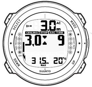 技术要求:任何时候,一旦超过了免减压时间,必须立即结束本次潜水。表面会如图六.1显示。“CEILING”和下面的3.0,表示上升到最高不超过3.0米的位置。“STOP”表示现在进入减压停留阶段。等于和向上箭头表示现在必须马上上升。“ASCTIME”表示包括安全停留的总上升时间为“9”分钟。于是,你应该以不超过上升速度的速度上升!这时,“ASCTIME”会是闪烁状态。