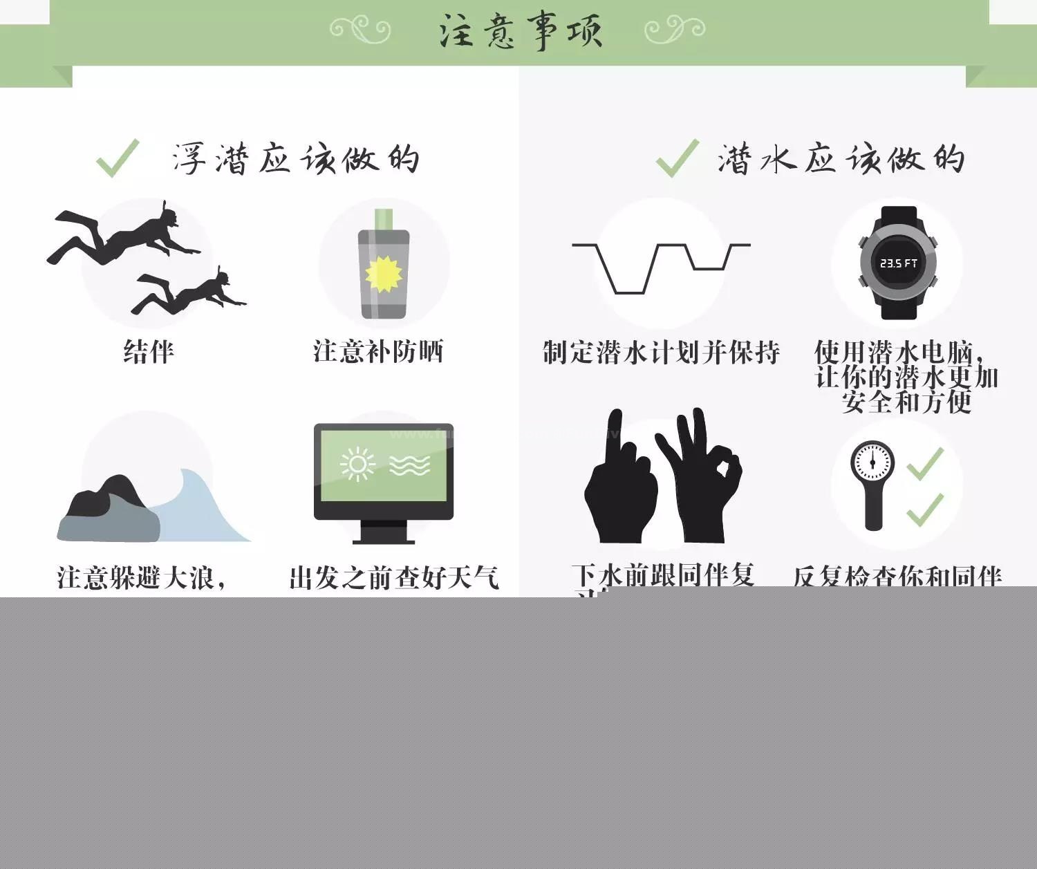 潜点的选择。水质好、能见度高是必须的,观赏千奇百怪的海洋生物是潜水最大的乐趣,面对浑浊的海水,连下水的欲望都没有。为了保证自由活动的范围和安全,潜点附近不应有码头以及过多的船只。同时,下水地点最好在平坦的沙滩或者海浪平缓的地方。