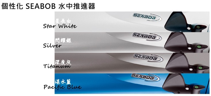 Seabob F7能够潜到水下40米深,可以持续运行60分钟,可以手动拍打10个转动装置来改变它的速度,潜水者运用体重来改变喷水器的倾斜角度来控制方向。它在水面的速度可达22公里每小时,在水中的速度也能达15公里每小时,整个喷水器重64公斤,在水中的浮力是8公斤。有蓝、银、红、橙、黄、白六种颜色,以及钛或铬合金供你选择。