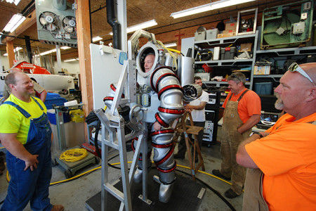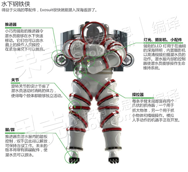 这台可穿戴潜水艇使得潜水员看上去就像是水下的钢铁侠。更重要的是,它内部的压力能够保持和水面上一样,从而保护潜水员在几百米的深度工作数个小时而不必担心减压病。