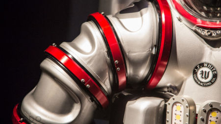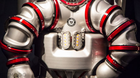 Exosuit看起来有些像一套更加臃肿的宇航服。重达530磅,长度超过6.5英尺。它的表面装配有18个连接关节配件的旋转接头,能保持最大程度的关节灵活,这使得潜水者在穿着Exosuit后仍然能够轻松在水下完成行走或游泳等动作。