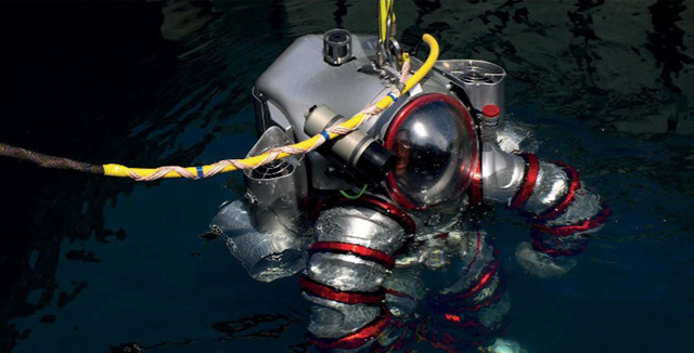宇航服相当于一艘微型的宇宙飞船。同样道理,目前世界上最先进的潜水服Exosuit,便相当于一艘微型潜水艇。它拥有自己的推进器,可在潜水员或者水面人员的操控下竖直或者水平运动。换气系统足以维持潜水员的生命长达50小时。通往水面船只的电缆不光为推进器提供动力,还能够传输声音、视频和数据连接。