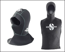 而水层下除了穿着防寒衣之外,有时会因为突如其来的一股冷水团而使人感到冰冷,或者是下潜深度超过二十公尺以上时,也会使得某些体质较怕冷的人感到不舒适,尤其是头部。这时,与潜水防寒衣使用相同材质的专用头套就派上用场了。