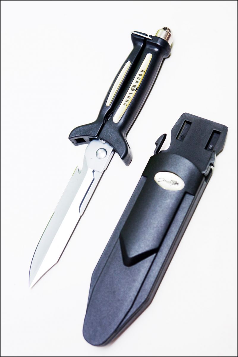 携带佩挂潜水刀下水,对于安全是比较有利的。使用时机非常广泛,例如万一身体被海里的鱼网缠住,潜水刀就可派上用场。