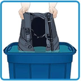 把水桶注入清水,水的高度必须能覆盖整件浮量控制器。根据清水的容量,每一加伦清水(约3.8公升)加入4樽盖份量(约1盎司)的 B.C. Life。跟着再把整件浮量控制器放入并浸泡约10分钟,以清洁外面的部份。