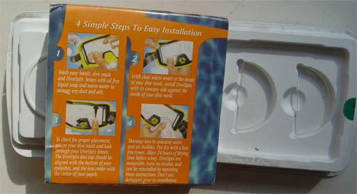 还有一种类似的产品,2片半圆形的软镜片靠水的表面张力吸附在面镜内侧的玻璃窗口上。这个产品的好处是可以放在任何一个潜水面镜上使用,缺点是面镜进水以后容易移动。