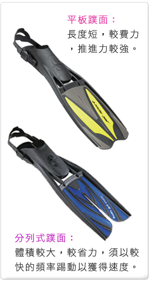 而目前市场上的主流则是渐渐走向分裂式蹼面的蛙鞋,这种蛙鞋的蹼面有一条纵的裂痕,蛙鞋像是被中间割开成两半一样,这种蛙鞋的特性就是省力,好踢,又不失前进的速度。是一种比较高科技的蛙鞋,特别适合初学者或女性潜水员,不需要极佳的腿力就可以轻松的在海中优游自在。