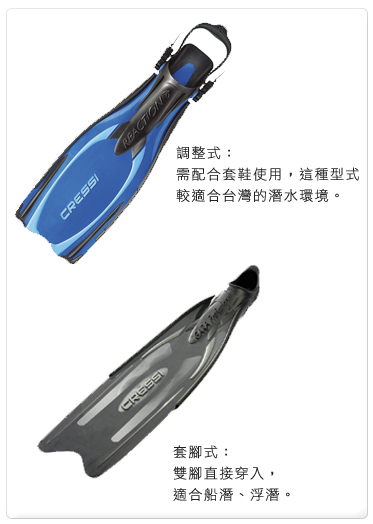 调整式蛙鞋则是必须先穿上一双套鞋,然后再套上蛙鞋。东南亚潜水活动多半是岸潜方式,通常必须在岸边行走一段距离才进入海水中,穿着潜水套鞋在岸边行走也比较安全(也能穿着溯溪用的防滑鞋)。调整式蛙鞋配备有可调整松紧的固定带,能适应极多数的脚型大小,但是入水后轻装不宜调整得太紧,通常只要不会因为摆动踢水而松脱即可,否则离开水面时就很有可能因为过紧而难以脱除。现在较新款的调整式蛙鞋大多有快卸扣的设计,出水时很容易脱下蛙鞋。