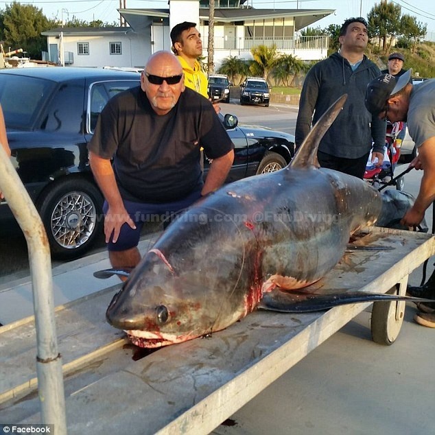 近日,美国加利福尼亚海岸的渔夫约翰.利史(John Lish)捕获一条长达20英尺(约合6.1米)、重达550磅(约合250公斤)的长尾鲨。