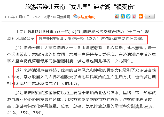 中国新闻网2012年03月06日报道,旅游污染让云南“女儿国”泸沽湖“很受伤”↓↓