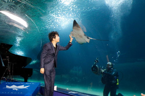 国际钢琴巨星郎朗出现在巴伦西亚的全欧洲最大海洋世界“L'Oceanogràfic Valencia”,进行了一次奇幻的海底音乐之旅。郎朗不仅在海底世界举行小型钢琴独奏音乐会,并与海洋动物朋友们友好互动。郎朗希望此次活动呼吁全世界共同保护海洋野生动物。