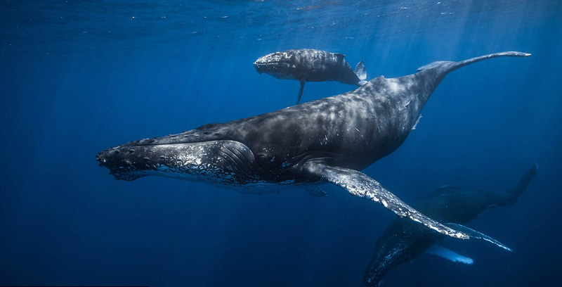 画面中,重达40吨的成年座头鲸虽然身躯庞大,但在深蓝色的海洋里游弋起来身轻似燕,十分优雅。一些画面中还展现了座头鲸一家亲密的家庭观念。
