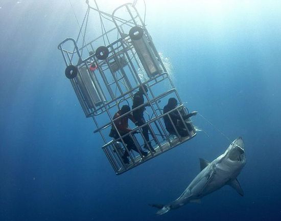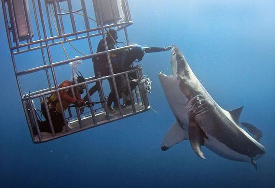 近日,在墨西哥瓜达卢佩圣母岛海岸,一名潜水员通过向大白鲨投喂食物将其引诱至笼子边,将他的手臂伸出,轻轻抚摸了大白鲨的鼻子。这一惊魂时刻被摄影师记录了下来。据悉,大白鲨通常可长达15英尺(约4.6米),重量则可达到5000磅(约2268千克)。2015年11月,曾有一名潜水员游到瓜达卢佩圣母岛海域,与被公认为世界上最大的大白鲨“深蓝”进行了面对面交流。“深蓝”年纪大约50岁左右,2013年开始出现在人们的视线中。摄影师曾公开过“深蓝”与笼子中的潜水员们嬉戏的画面。