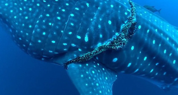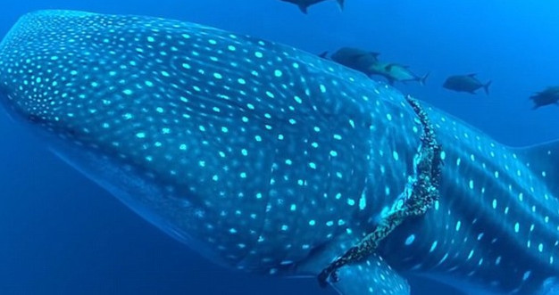 这只鲸鲨体型巨大,一根粗绳缠绕着它,这根绳子可能已经缠绕它多年。它不断挣扎着,试图摆脱束缚自己的绳子。