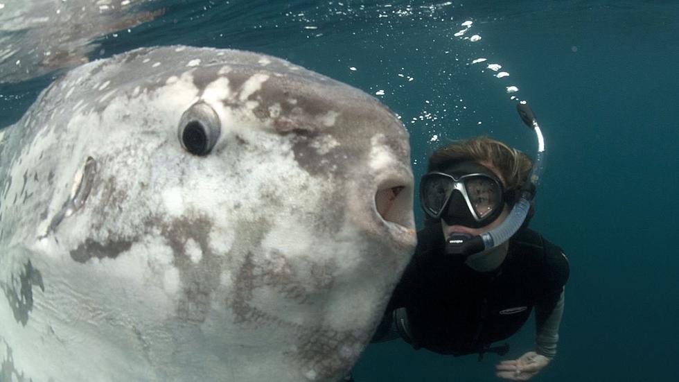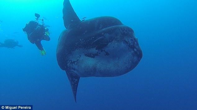 据《每日邮报》报道,葡萄牙海岸附近发现了高达5米的巨型翻车鱼,潜水员只有它的鱼鳍那么大。