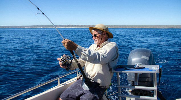 布伦德尔把船停在澳大利亚西部的宁加卢海岸,准备捕一条旗鱼。经过一场精疲力尽的“猫和老鼠”式的对抗,一条旗鱼终于上钩。