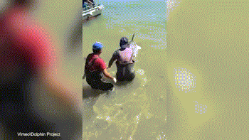 几个乘坐小艇的渔民很快过来,将这只海豚拖回到了深水区。不过,海豚似乎已经放弃了挣扎,它在水里打转,似乎已经不能很好地浮到水面。