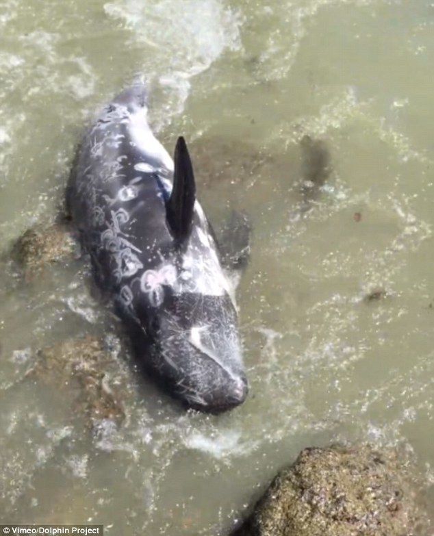 在日本太地町的海湾里,海豚保护者瑞克·欧贝瑞拍摄下这只年轻的海豚艰难求生的场景。每年在这里都有数千只海豚被捕捉或屠杀。这是一只雄性的里氏海豚。这只海豚绕着岩石游动,明显已经失去了方向,看上去十分痛苦。