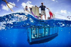坐进玻璃潜水箱里,不用湿身就可欣赏海底的大白鲨。
