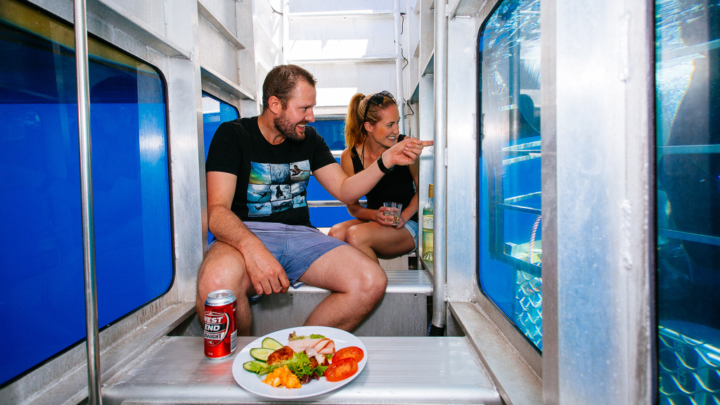 现在,如果你去南澳大利亚的Lincoln港,就可以坐进一种最新的Aqua Sub(玻璃潜水箱)里欣赏大白鲨。这种潜水箱可以容纳最多6~8个人,整个箱子的形状就像一艘小船,通体是透明的,客人先坐进漂浮在水面上的潜水箱中,待人坐齐后关上舱门,再慢慢地深入海中,在这个过程中,可以一边品尝美食、饮料,一边欣赏海底美景,还能邂逅经常出没在这里的大白鲨呢!