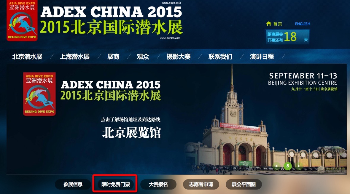 2015年8月31日前,登录ADEX CHINA 2015北京国际潜水展官网(www.bidsid.com),点击“限时免费门票”,注册即可收到二维码,凭二维码可在会场票亭兑换免费门票。