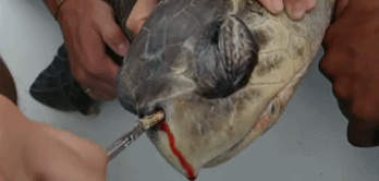 血从海龟的鼻孔里流了出来,但是异物还是没有取出。