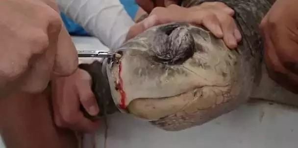 一个研究小组在哥斯达黎加海域附近勘察的时候,发现了一只痛苦而绝望的海龟。