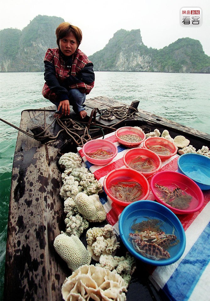 由于可开采珊瑚基本都产于热带和亚热带地区,因此打捞珊瑚在东南亚地区也一度非常流行。图为2000年12月31日,越南亚龙湾,一名渔民正在兜售打捞出来的珊瑚石。AFP PHOTO/Hoang Dinh NAM