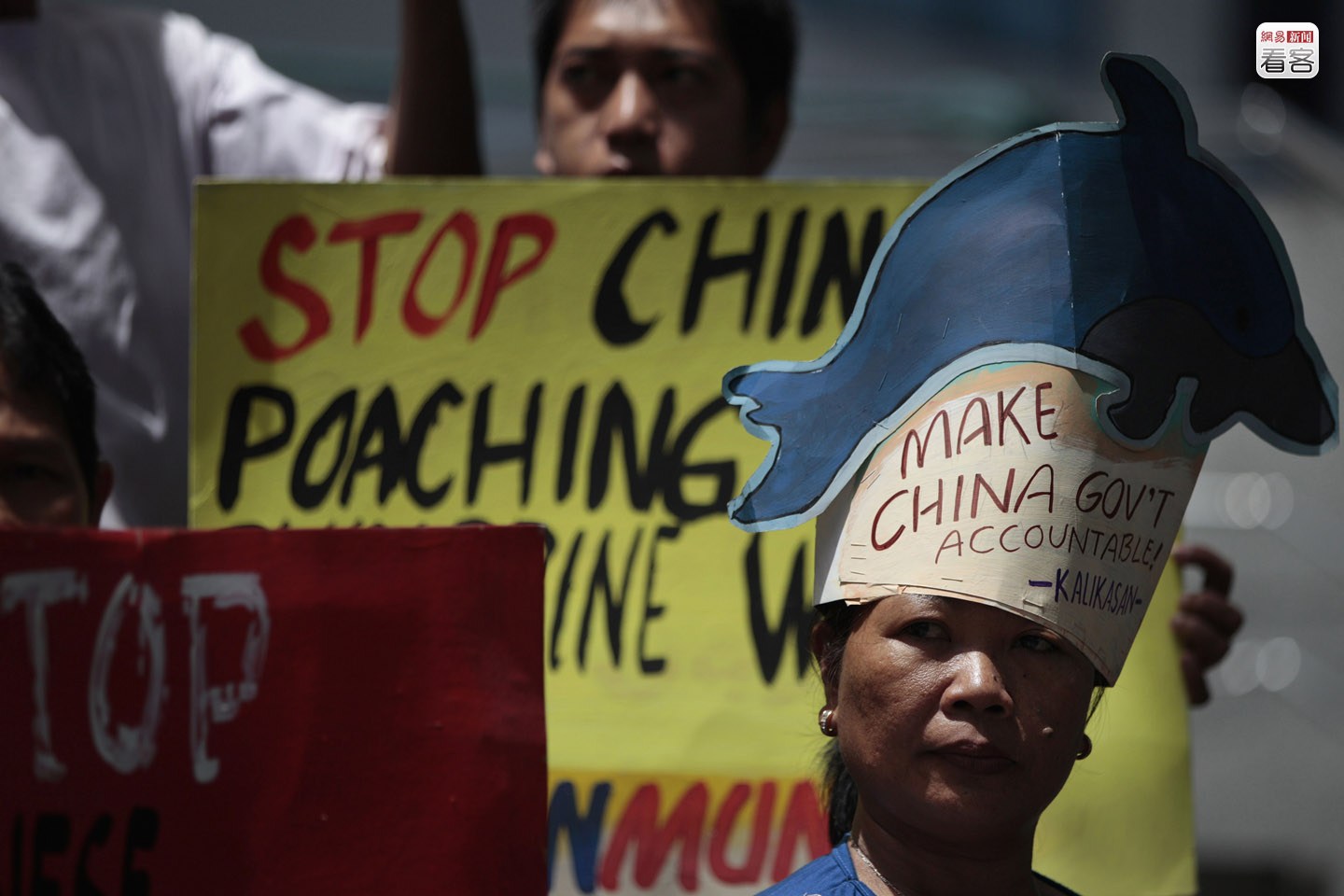 2013年4月111日,菲律宾人在菲律宾政府门前抗议,要求严惩肆意打捞珊瑚的中国渔民。12名中国渔民因为打捞了菲律宾自然保护区内的珊瑚而遭到拘留。AP Photo/Aaron Favila