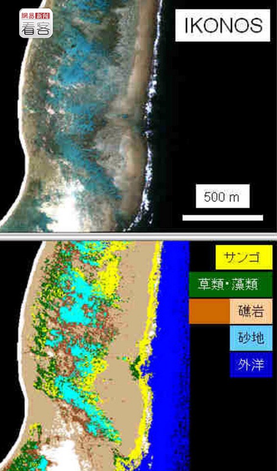 除南海,日本冲绳外海的珊瑚资源也非常丰富。日本政府为了保护珊瑚资源,甚至动用卫星对珊瑚岛礁进行勘察。图为日本国家环境研究中心提供的美国Ikonos商业卫星拍摄的图片,上图是冲绳Ishigaki岛附近的珊瑚礁的海洋探测图,下图用来分析珊瑚礁的健康状况。
