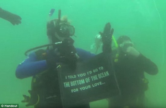 紧张而激动的Markie在潜到6米深的时候,发现正在潜水的女友,随即游了过去,举起条幅,向女友深情说到:“我曾对你承诺过在海底求婚,但现在我只拿到了18米的潜水证书,你会嫁给我吗?”