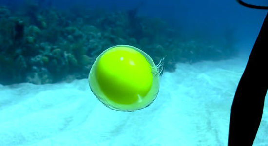 当潜水员在鸡蛋上方转动手指,鸡蛋下方的海水向上推动,使蛋清均匀地包裹在蛋黄周围,成为双层球体。它在水中轻轻摇曳的样子神秘又令人惊喜。