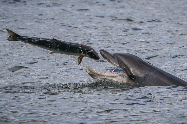据英国《每日镜报》报道,英国40岁的导游萨拉·佩恩(Sarah Pern)在苏格兰东海岸拍到到宽吻海豚捕食大马哈鱼的精彩一幕。照片显示,一条大马哈鱼刚跃到空中,一只宽吻海豚随即冲出海面,将大马哈鱼吞入口中。