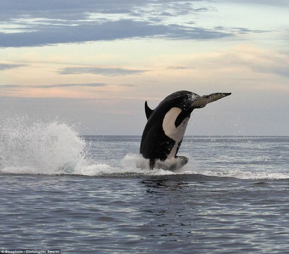 落日开始令天空变成粉红色,一条虎鲸跃出水面,飞向高空,身后洒落无数水花。这是一个极其壮观的画面。这条鲸鱼的潜水无疑是有目的的。它下面15英尺(约合4.5米)的海豚颤抖着身体,慌忙逃窜。