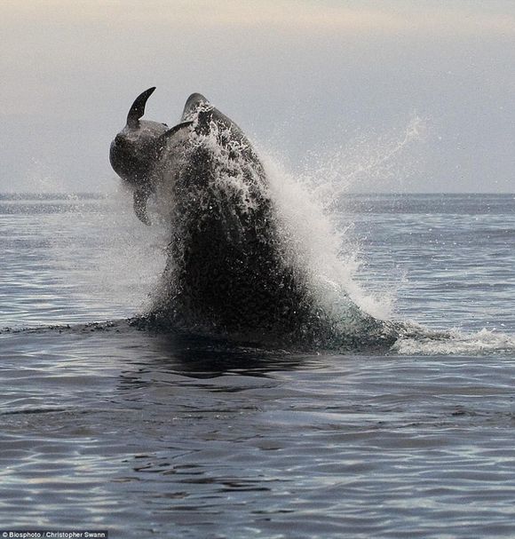 这些令人惊讶的照片记录下一场持续2小时追逐的最后一幕。这场生死较量以海豚被8吨重虎鲸吞入口中宣告结束。这条海豚起初是一小群在墨西哥海岸附近游动的海豚的成员之一,但其他成员在虎鲸来袭时成功逃脱,任由它受到一整群鲸鱼的摆布。