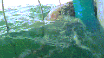 紧接着,希拉里把相机举出了海面,她尖叫道:“噢我的上帝!”大白鲨似乎被她的声音转移了注意力,转向了笼子的另一边。最终,它终于感觉到疲倦,放弃了笼子里的“大餐”,转身游走了。