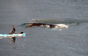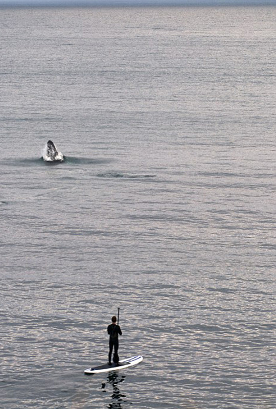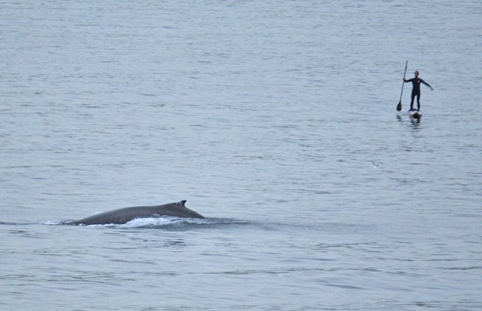 詹森和同伴在海滩冲浪漂移时,一头座头鲸突然在他旁边破水而出。