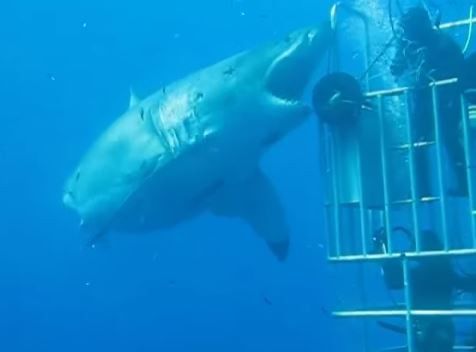 墨西哥瓜达卢普岛(Guadalupe Island)附近发现一条巨型大白鲨,科学家估计年龄约50岁、体长达6米,将它命名为“深蓝”(Deep Blue)。国外一名潜水专家站在无顶的铁笼内,与它直接互动,大胆摸鲨鱼“握手”,之后干脆跑出去一起游泳。