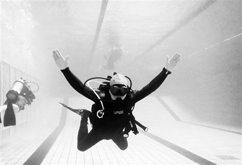 潜水爱好者在奥体中心游泳馆体验潜水。