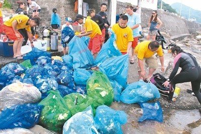 基隆市救难协会队员不一会儿就清出一包包的垃圾。