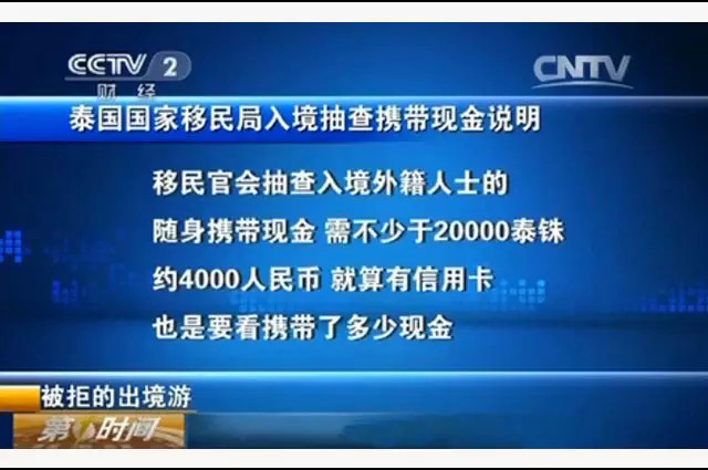 前几日,央视一则“不带4千不让玩”引起了网友的热烈讨论。因为泰国国家移民局入境抽查时移民官会抽查入境外籍人士的随身携带现金,需不少于20000泰铢,约4000人民币,银行信用卡等无效。如果抽查到不够标准,移民官将会拒绝该外籍人士入境。国庆期间,仅四川就有100多名出游泰国的中国公民被遣返。