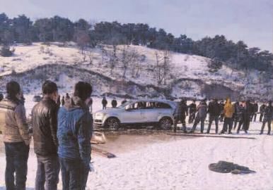 2月1日12时10分许,长春市九台区牛头山水库,一辆奥迪Q7越野车掉进冰窟窿,不足5分钟,整个车体就被冰水淹没,车内3人陆续跳窗逃生。