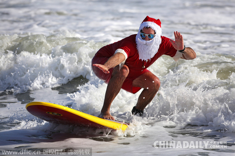 当地时间2014年12月24日,美国佛罗里达州,数百名民众穿着圣诞老人的服装冒着严寒冲浪,为慈善筹款帮助癌症患者,今年为该活动举办的第6年。