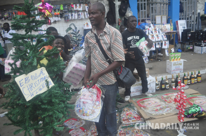 当地时间2014年12月24日,利比里亚蒙罗维亚,一男子在商店购买圣诞树。由于埃博拉疫情,政府禁止了所有可能导致病毒进一步传染的节日活动,这里没有节日派对,没有圣诞晚会。据悉,在过去一年,西非有超过7000人死于埃博拉疫情中。