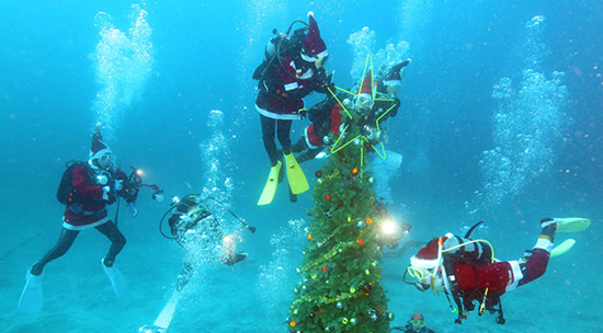 前来潜水的游客可以和穿着圣诞老人服装的导游合影,享受别有风味的圣诞节。