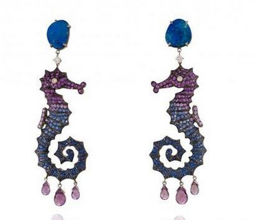她把灵感焦点放在了深海,以海马和螃蟹做为主题,她将海马描绘成穿着珠光宝气的王者,佩戴着王冠,高高在上的俯视着一切,螃蟹则精巧可爱的挥舞着大钳子游走在周围。蓝紫色宝石与蛋白石交相呼应,营造出一种深邃的渐变色彩,打造出一个梦幻般的海底世界。